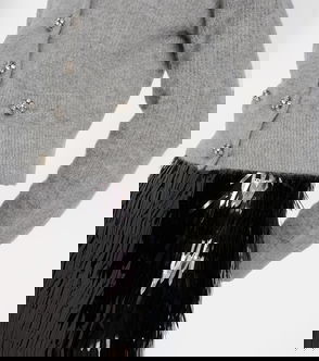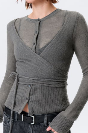 A cropped wrap cardigan made from a soft yarn composed of responsible materials. This lightweight knit has a plunging neckline and an extra long drawstring tie that wraps twice around the body.