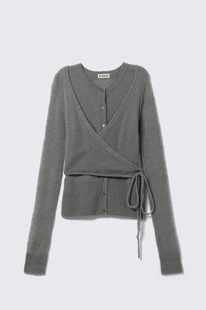 A cropped wrap cardigan made from a soft yarn composed of responsible materials. This lightweight knit has a plunging neckline and an extra long drawstring tie that wraps twice around the body.