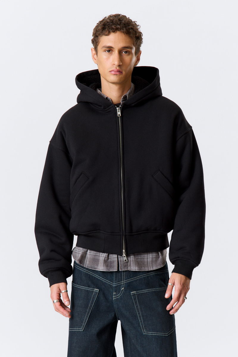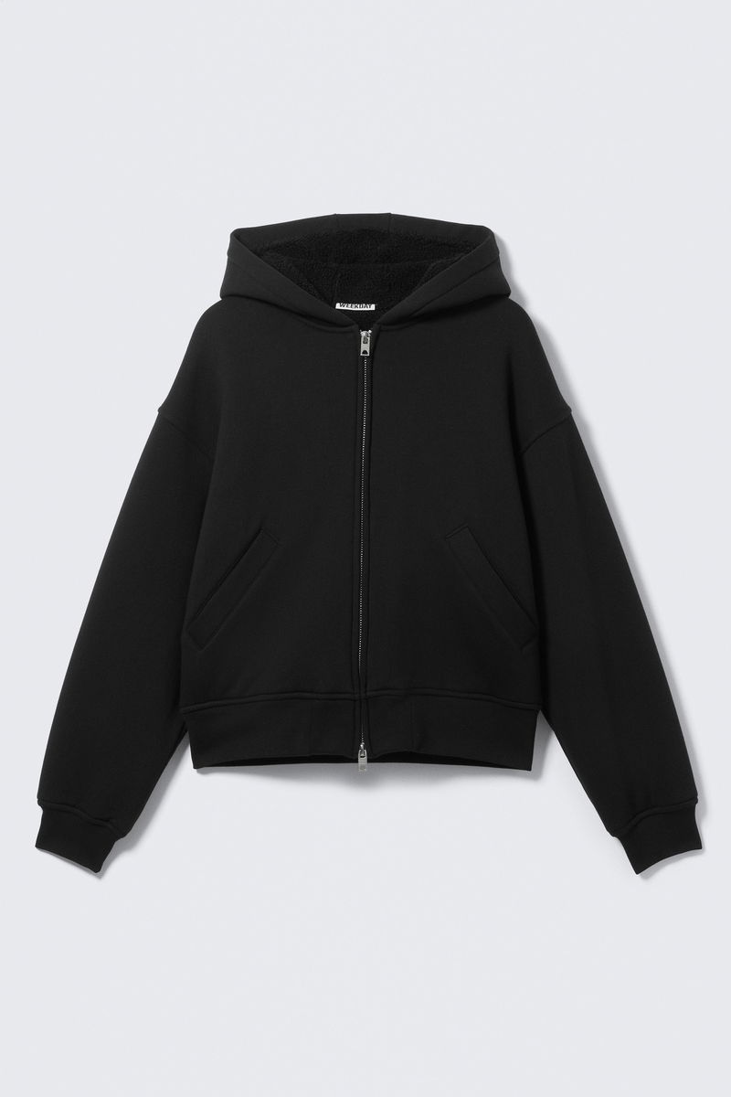 A zip hoodie crafted from a heavyweight cotton fleece with a soft pile lining for extra warmth. Designed with a loose fit and a bomber-inspired shape with a two-way front zipper. It features a panelled hood, welt pockets, and ribbed cuffs and hem.