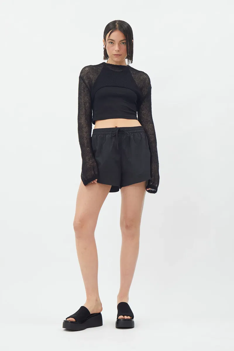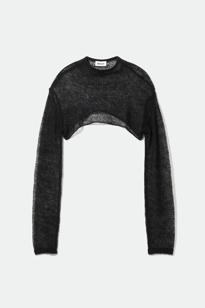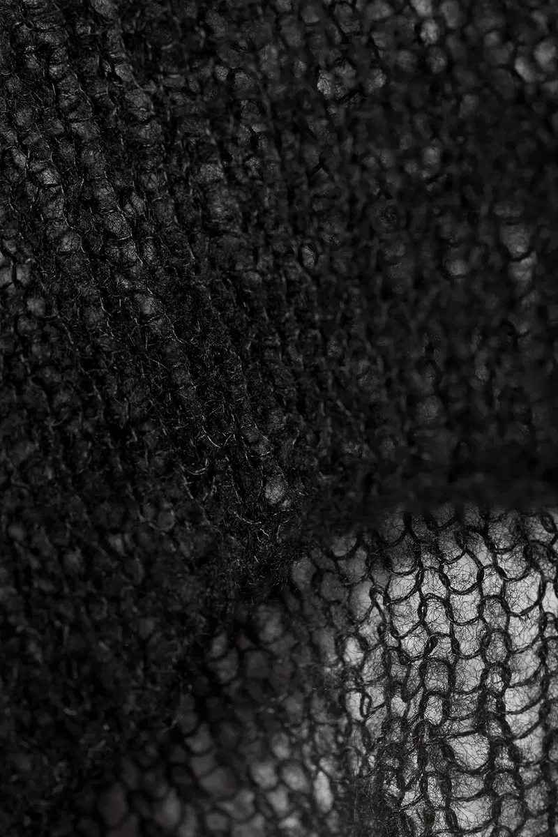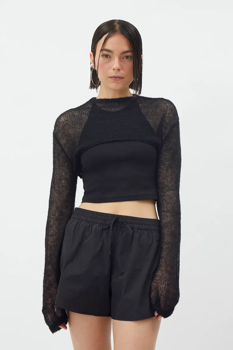 A lightweight loose knit shrug made from a soft wool enhanced yarn. This standout piece has a high neck, fully fashioned arm seams, long wide arms with ribbed cuffs, and self finished edges.