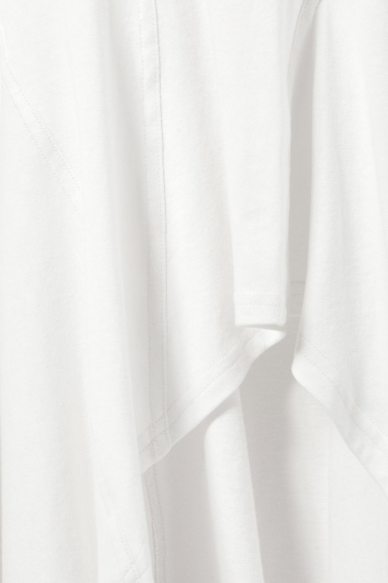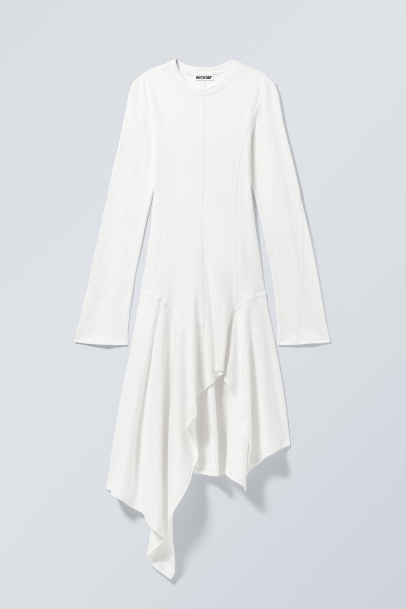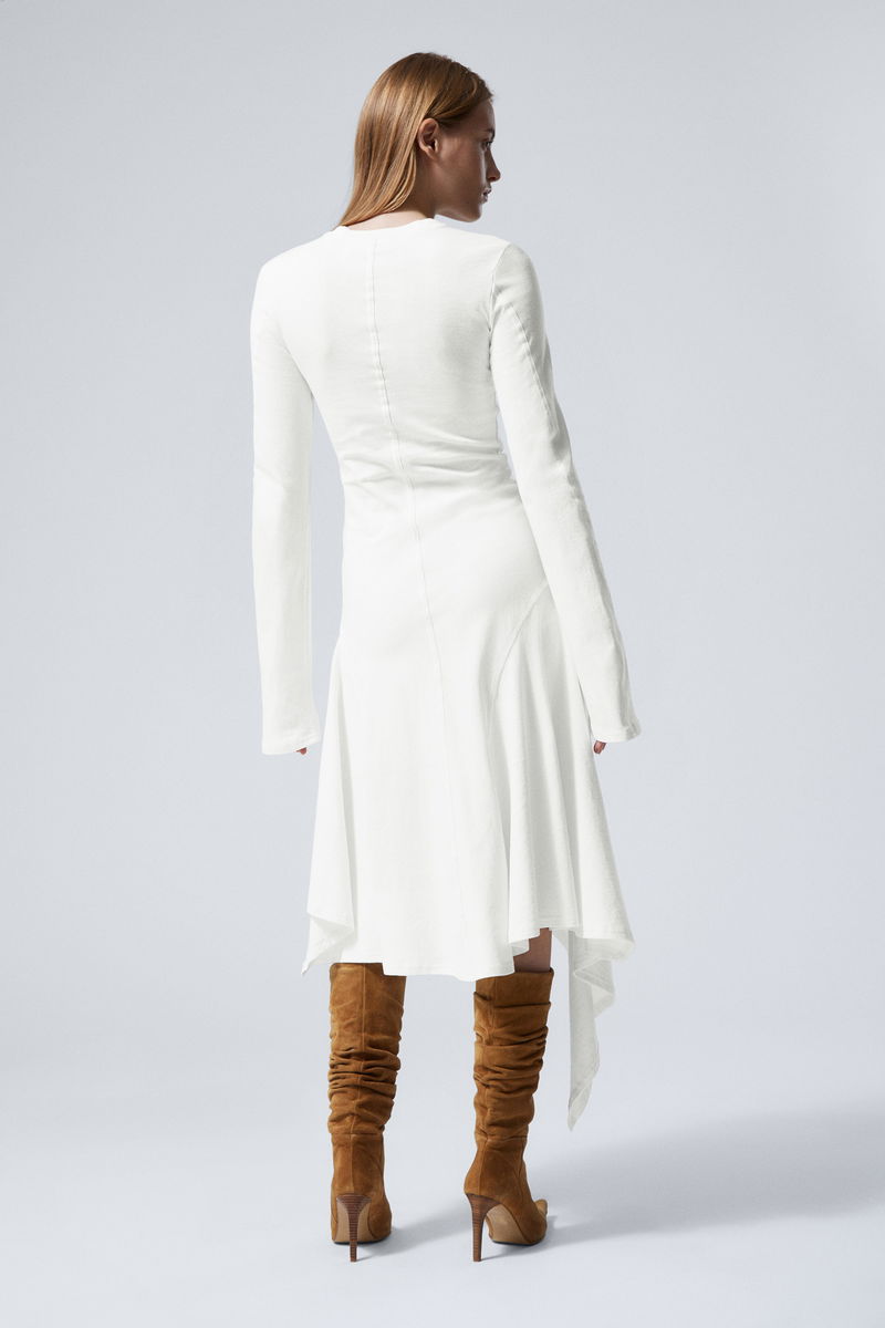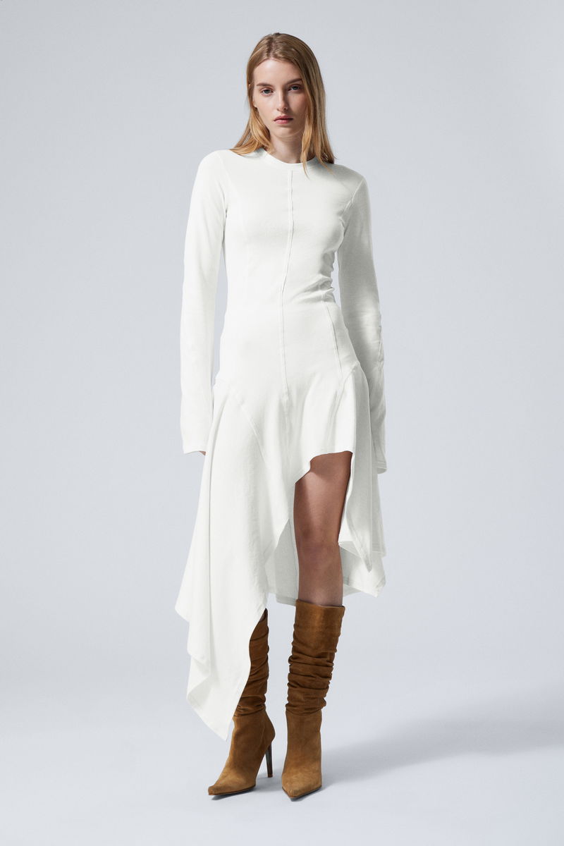 A long-sleeved asymmetric midi dress crafted from soft cotton jersey, cut to a slim fit. It features a round neckline, fornt and back centre seams, slightly fluted sleeves, and a fluid, asymmetric skirt.