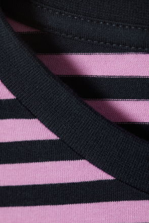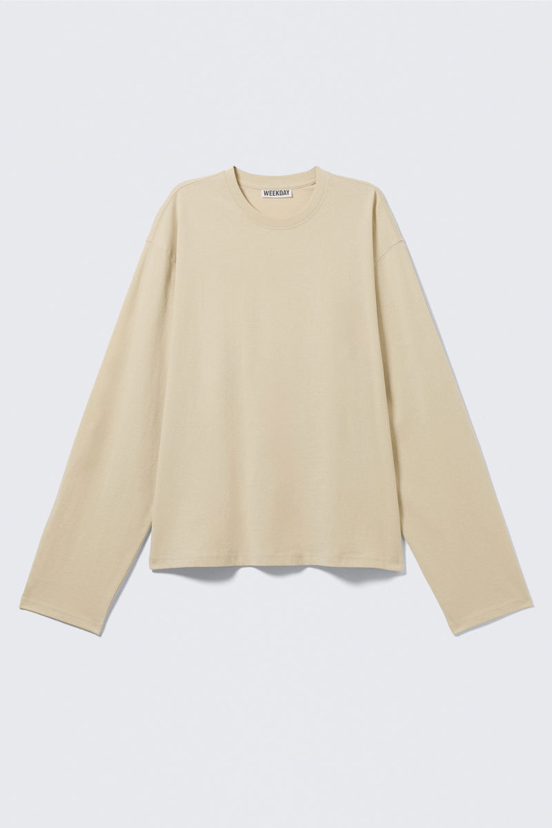 A long-sleeved t-shirt crafted from soft cotton jersey, cut to a loose, boxy fit. It features a round ribbed neckline and a straight hemline.