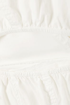 A long-sleeved wrap shirt crafted from crisp poplin cotton, cut to a slim fit. It features a clean, contemporary silhouette, a sharp collar, soft drape, vented sleeves, and tie-around straps that cinch the waist for an adjustable fit.