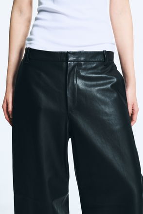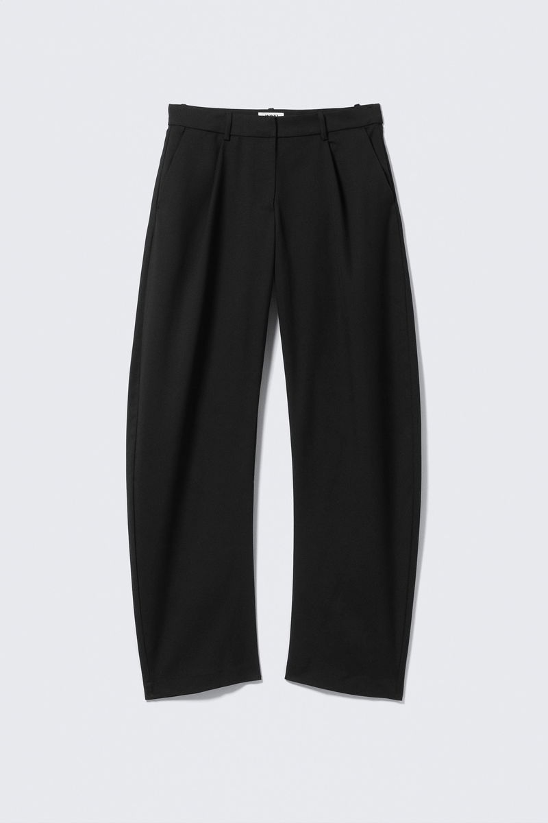A pair of mid-rise suiting trousers with a loose fit and cocoon-shaped leg. Designed with a zip fly and hook-and-eye closure, slanted side pockets, and back welt pockets.