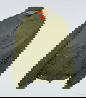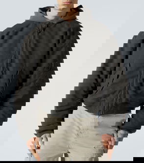 A hooded bomber jacket with a loose fit crafted from a sturdy recycled polyester twill. This go-to features a hood with a faux fur brim, a sturdy versatile 2-way zipper, gathered sleeve seams, fleecy chest pockets with zippers, an inner pocket, and elasticated hems.