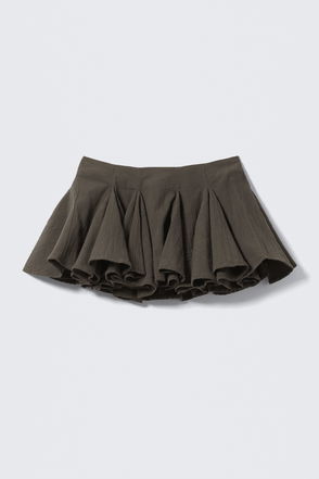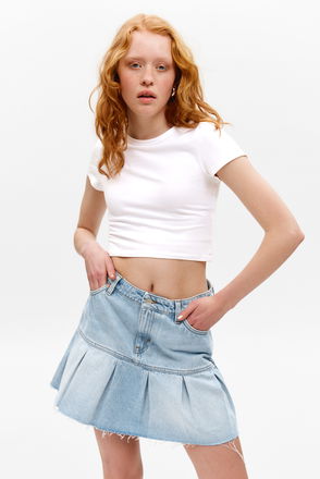 A low waist mini skirt crafted from an organic cotton rigid denim, enhanced with recycled cotton. It features a zip fly, front pockets, vertical seams creating a panelled effect, and has a flared hem with frayed edges for a contemporary look.