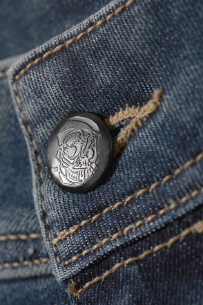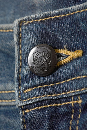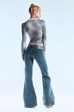 A pair of low-rise jeans with a slim fit and flared leg, crafted from organic cotton comfort-stretch denim with recycled cotton and recycled polyester. Designed with a zip fly, embellished back flap pockets, and embellished belt loops for a subtle statement finish.