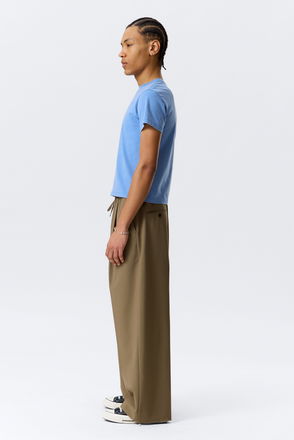 A pair of loose fit twill suit trousers with a low waist. They feature a zip fly, slanted side pockets, buttoned back pockets, and front and back pressed creases.