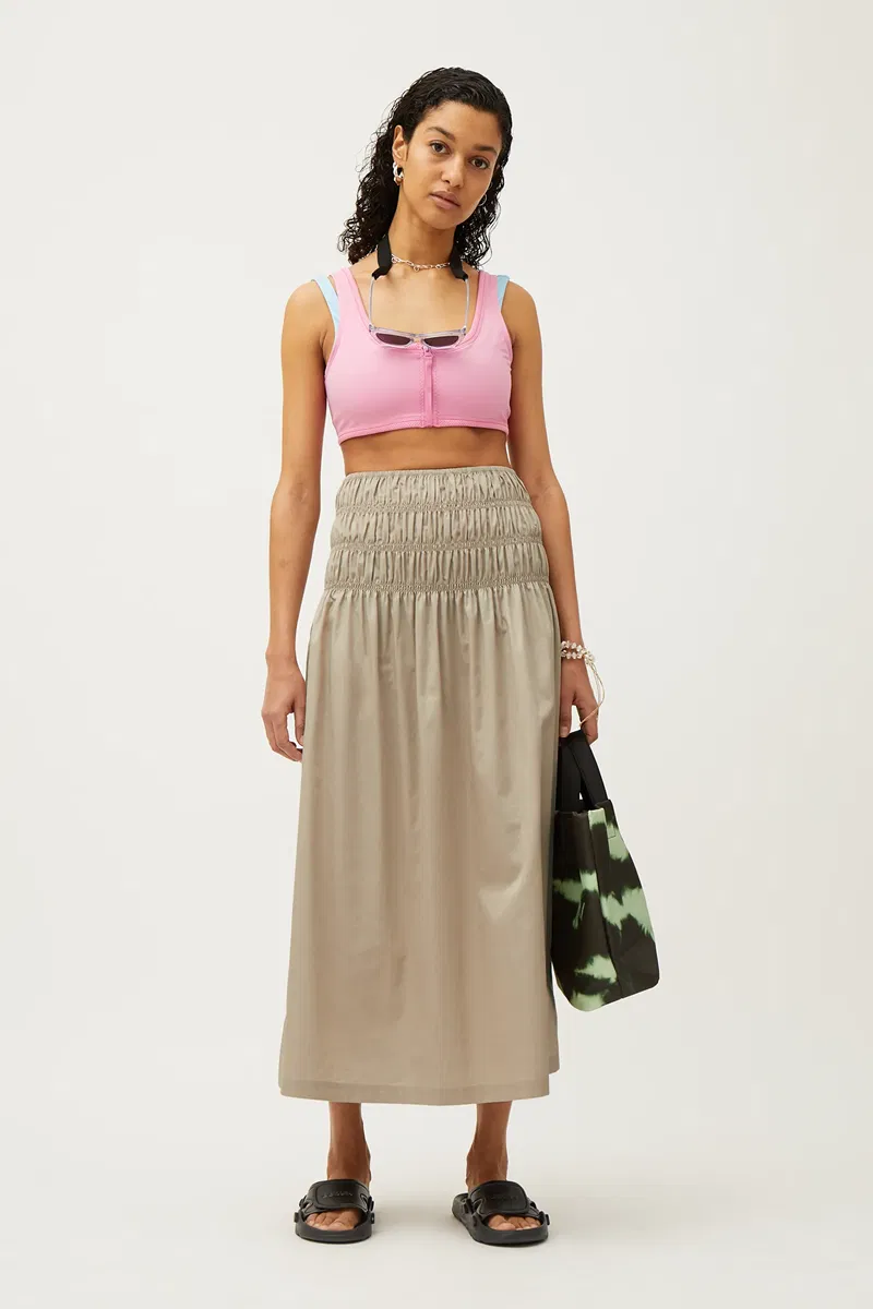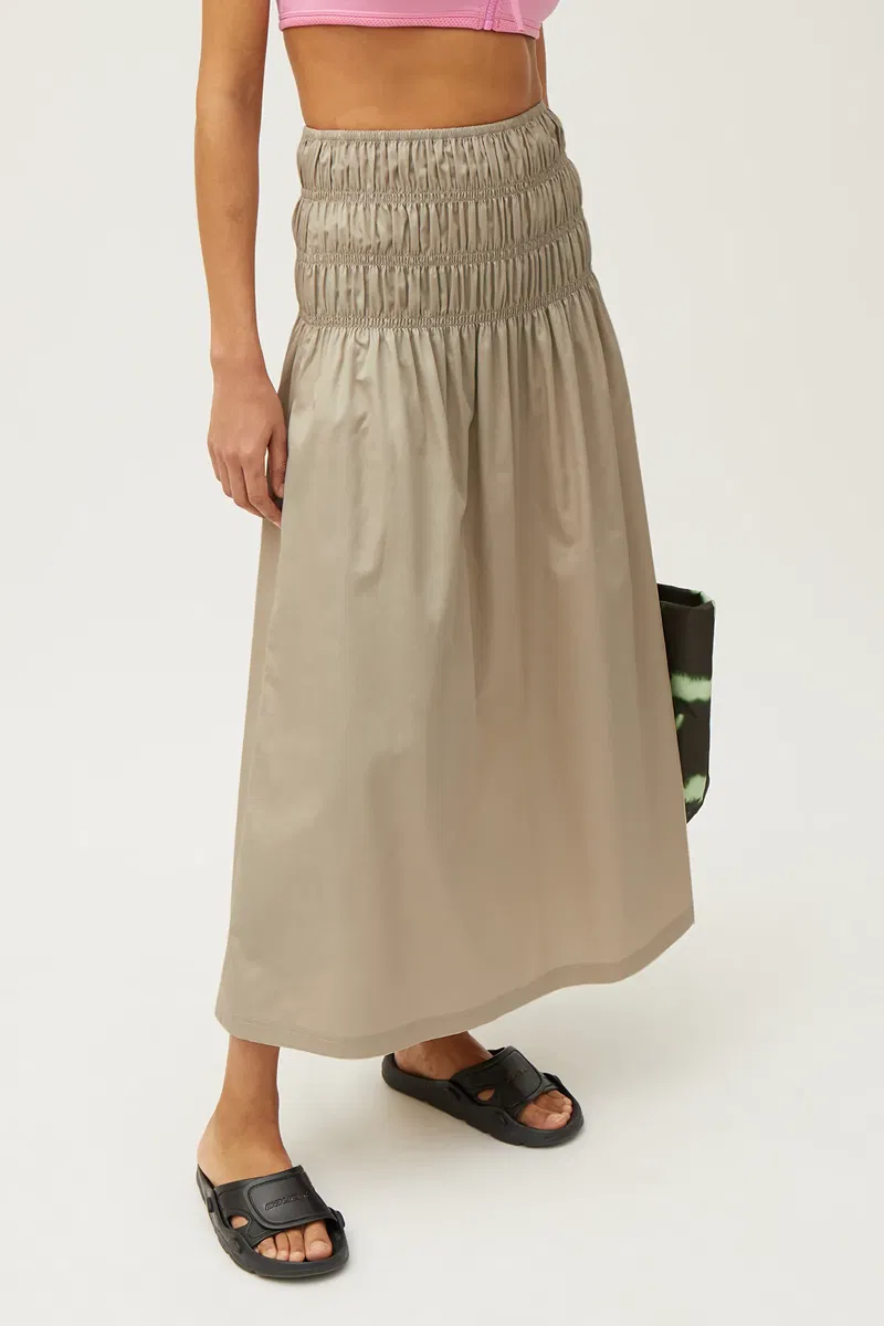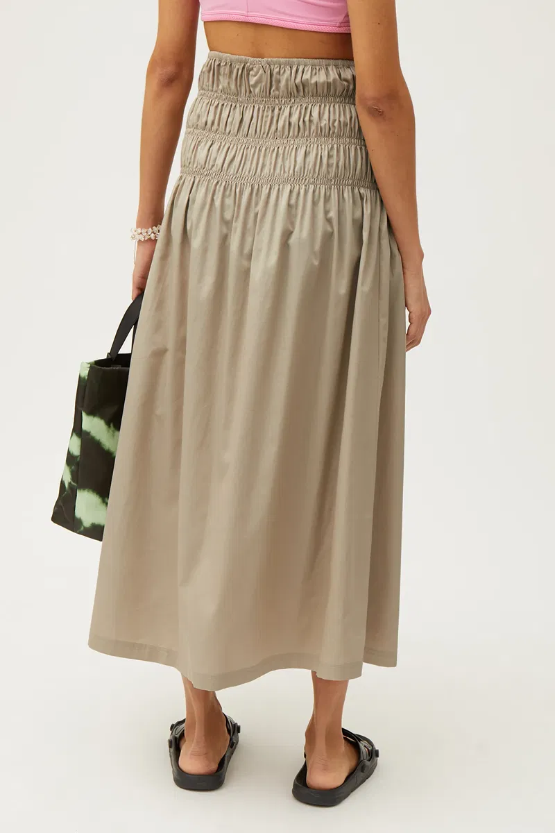 The Maxim Skirt is an A-lined maxi skirt with a smocked waistline.