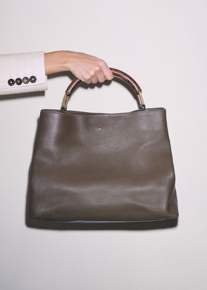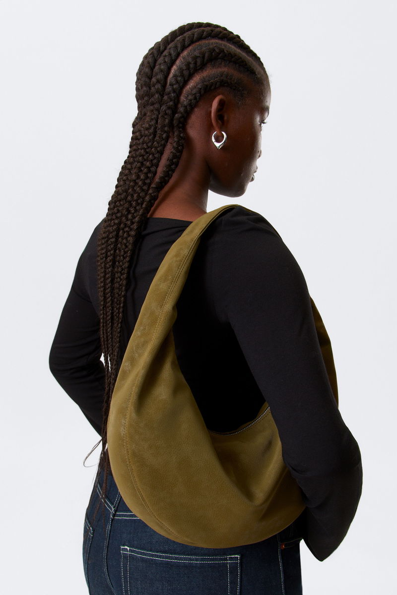 A medium-sized shoulder bag with a rounded silhouette, designed with a top zip closure. Measures approximately 34 cm in width, 38 cm in height (including the handle), and 6 cm in base depth.