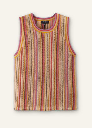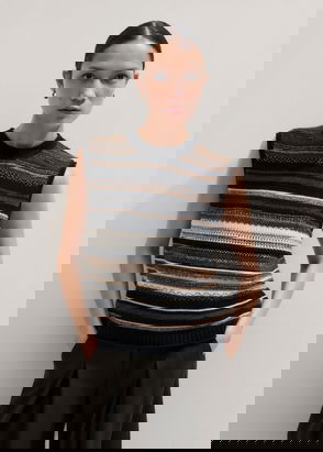 A cable-knitted vest crafted from a metallic coated cotton yarn. It features a V-neckline and ribbed edges.