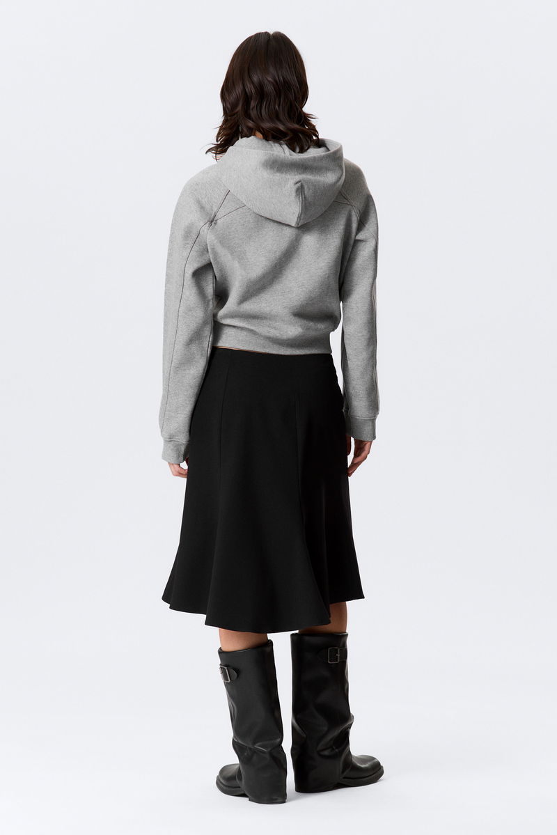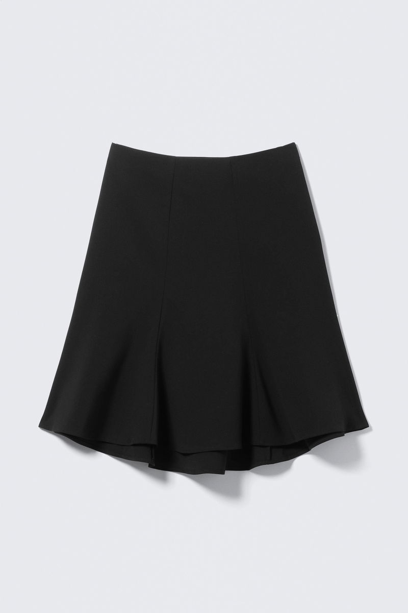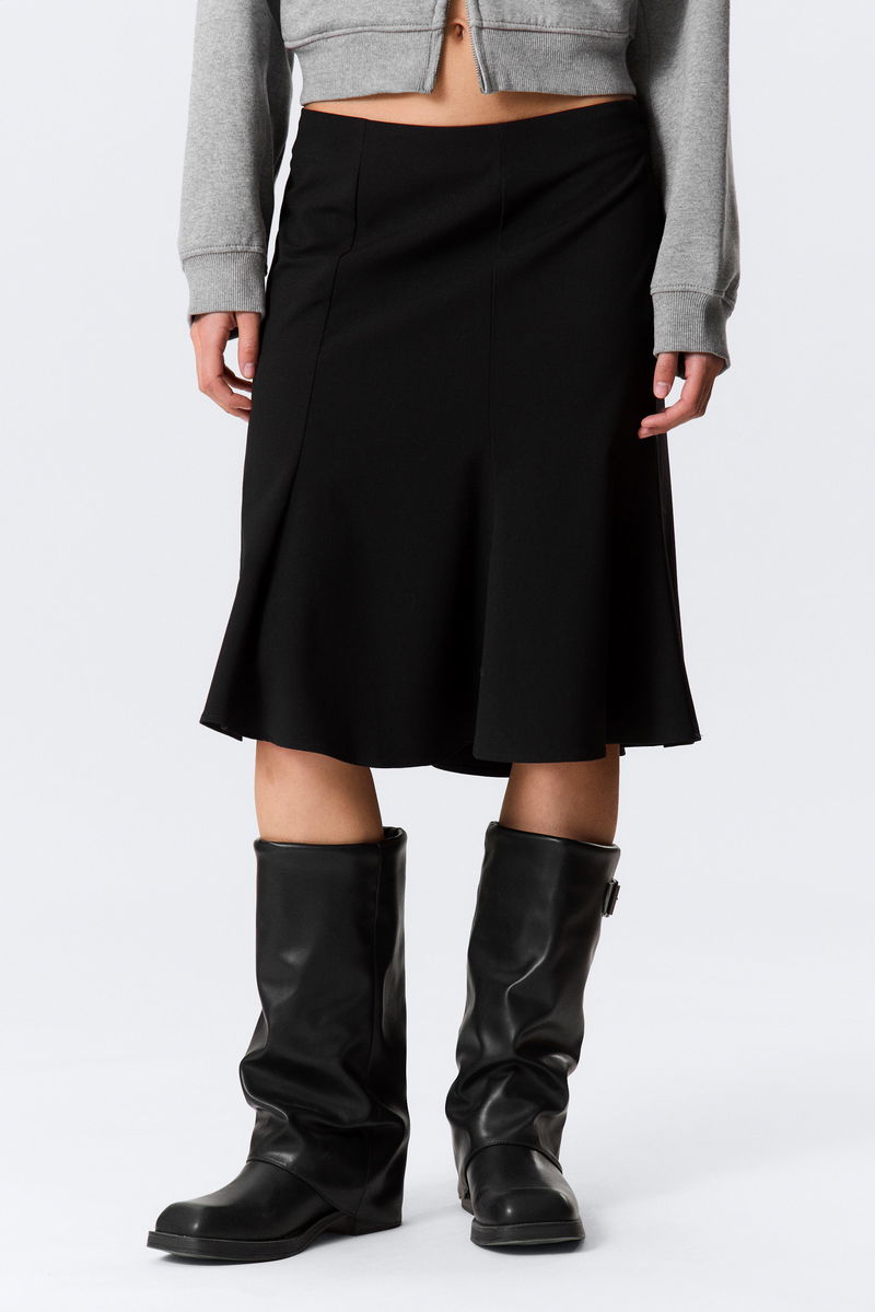 A flared midi skirt with a mid-rise waist. Designed with an invisible side zip closure and a softly flared hem for added movement.