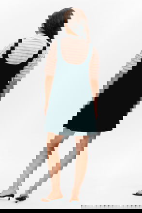 A mini suiting dress crafted from a mix of recycled polyester and viscose, enhanced with a touch of recycled elastane for added stretch and comfort. It features a boat neck, adjustable shoulder straps, and wrap seam detailing for a sophisticated look. The dress is designed with a clean finish and an open back.