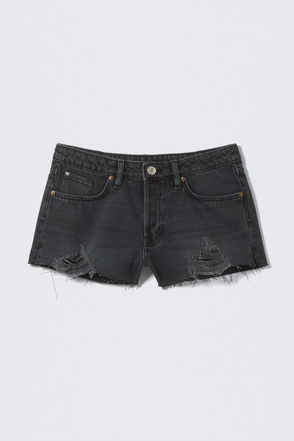 A pair of loose-fit, knee-length, low-waisted denim shorts made from an organic cotton rigid denim enhanced with recycled cotton. They have a classic five pocket look and folded hems.