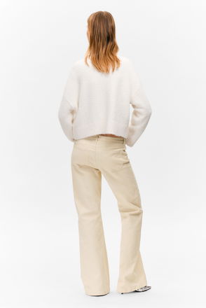 A pair of low waist slim fit bootcut cord trousers crafted from recycled polyester and cotton.