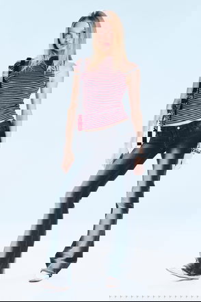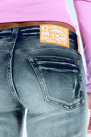 A pair of low waist slim fit bootcut jeans made from rigid organic cotton denim. They have five pocket detail, a zip fly, and a fabric label.