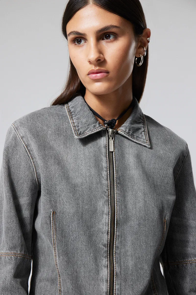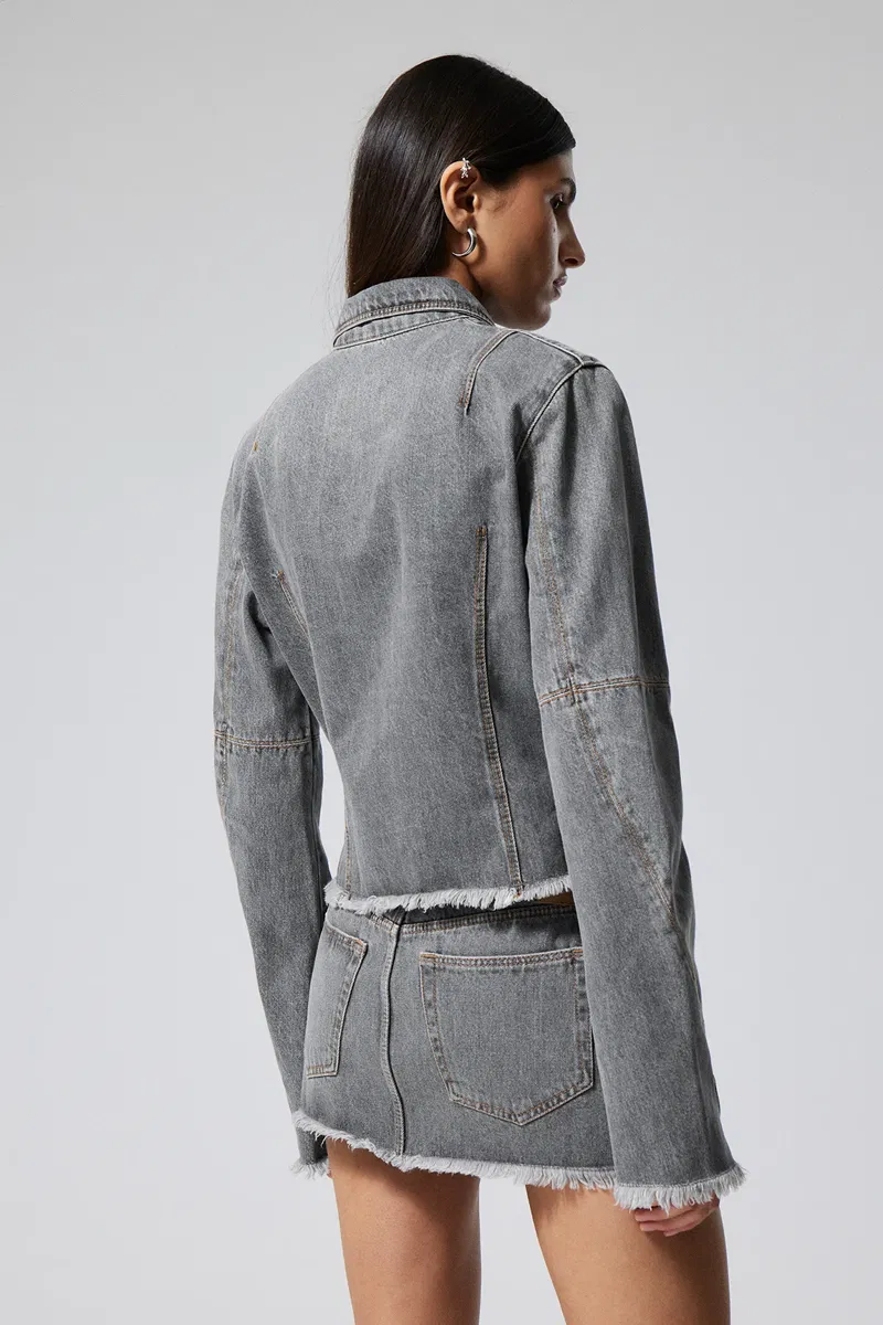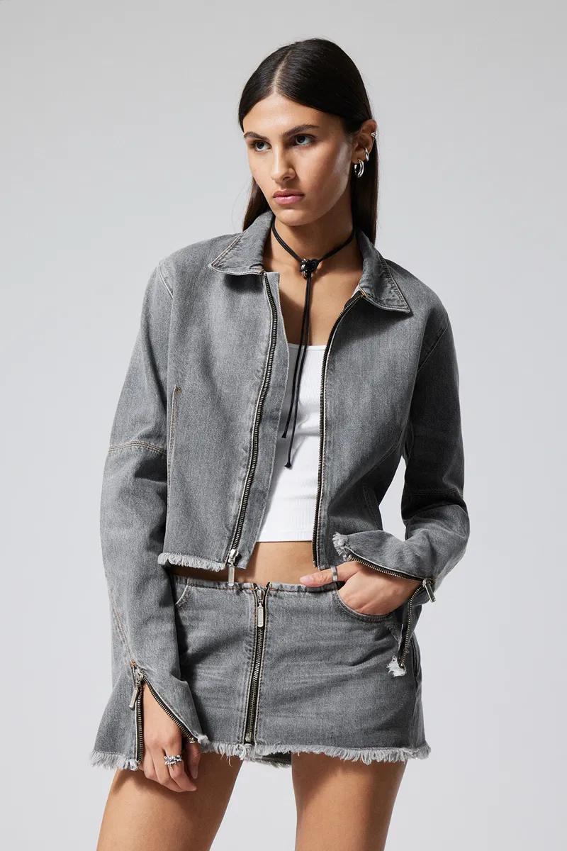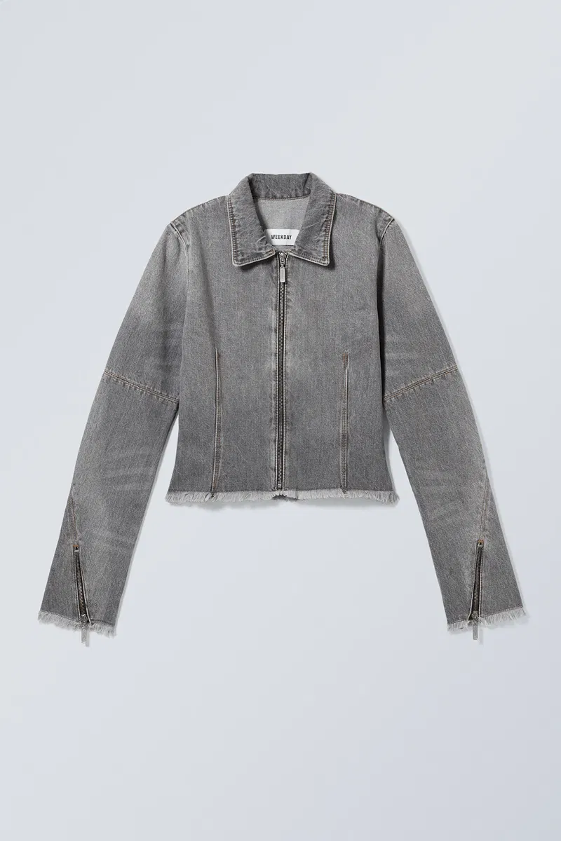 A short slim fit denim zip jacket made from organic cotton denim enhanced with recycled cotton. It has a shirt collar, a metal zip front closure, two vertical darts on each side of the front zipper, frayed bottom- and cuff hemlines, and cuff slits with zip closures.