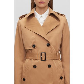Featuring a double-breasted design with eight buttons, a wide notched collar, and a high back vent for ease of movement. The adjustable belt and cuff straps with metal eyelets add a refined edge, while the large side pockets provide practicality.