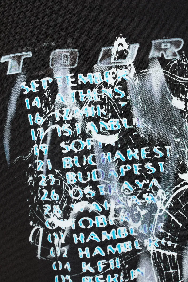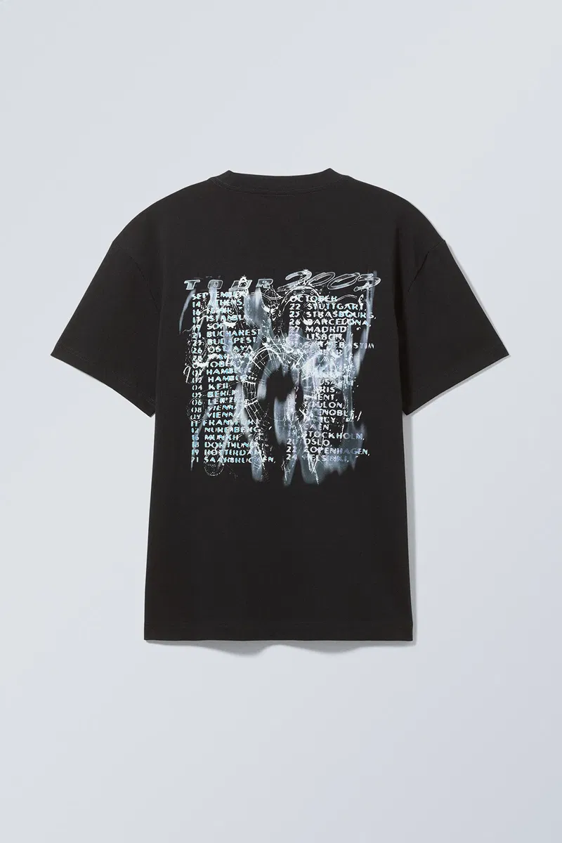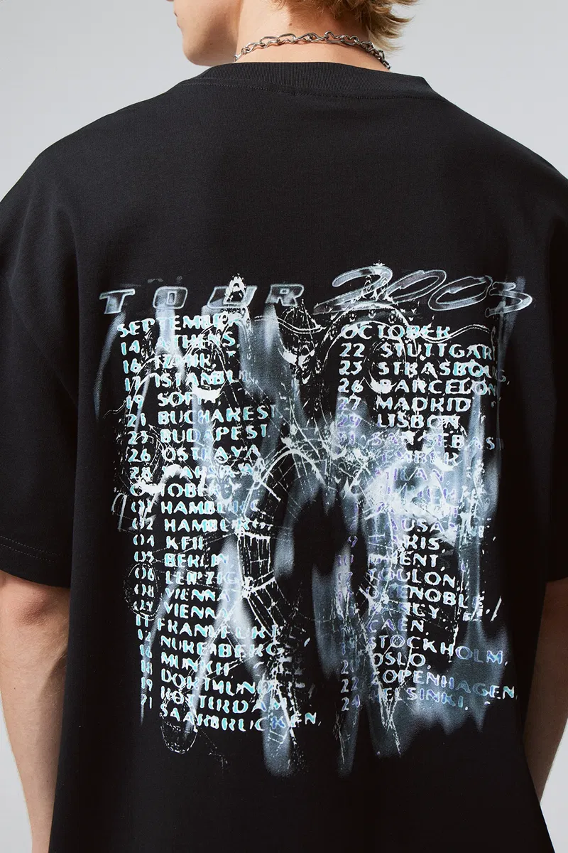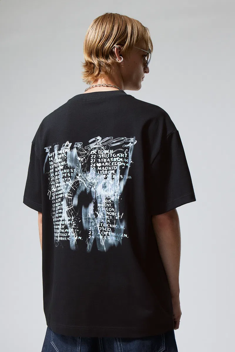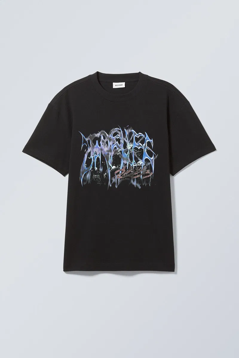 An oversized t-shirt made from a soft cotton jersey with a screen print. It is loose fitting with dropped shoulders and wide sleeves.
