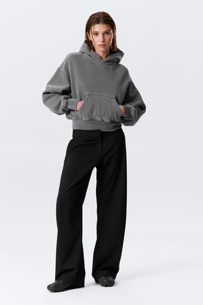 It features a slouchy silhouette with dropped shoulders, a kangaroo pocket, a large, roomy hood without a drawstring, and ribbed hems.