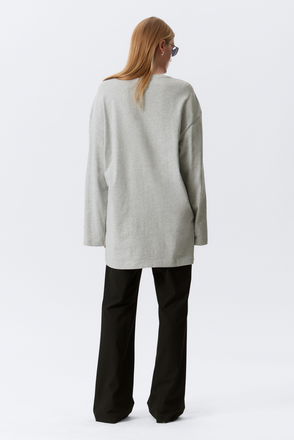 A long, oversized long sleeve t-shirt made from a soft single jersey cotton. It has extra-long, roomy sleeves, a ribbed, round neckline, and folded hems.