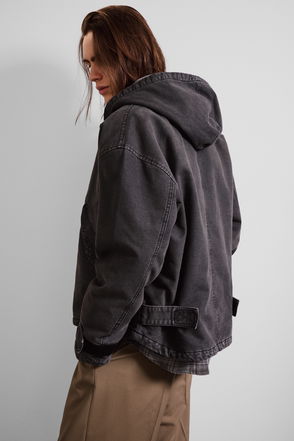 An oversized jacket crafted from durable nylon with a soft corduroy collar.