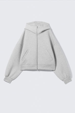 An oversized scuba zip-hoodie with a structured fit and smooth texture, crafted from recycled polyester enhanced with viscose and recycled elastane for extra stretch and comfort. This favourite feature a double layered hood, a versatile two-way front zipper, front pockets, and folded cuffs and hem.