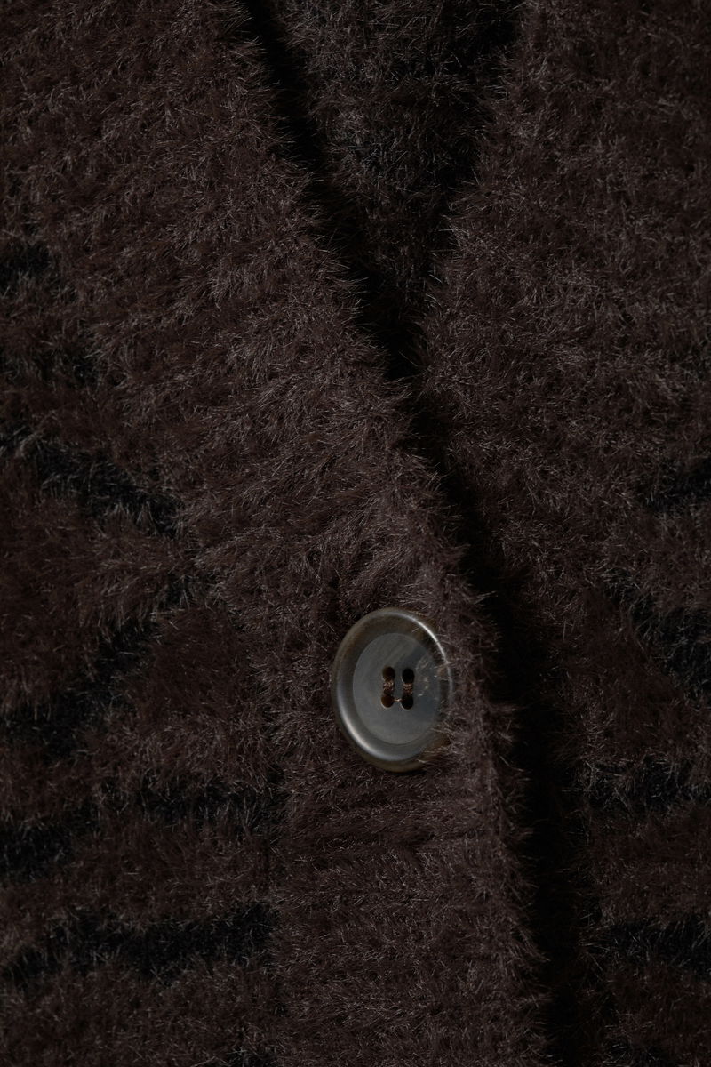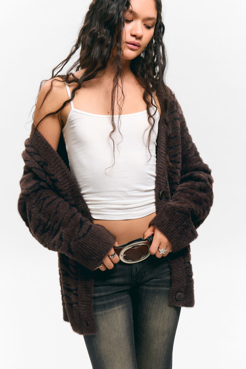 A cardigan crafted from soft, textured yarn with a fluffy finish,designed for an oversized fit. It features a deep V-neckline, front button closure, and dropped shoulders. Finished with ribbed trims at the cuffs and hem.