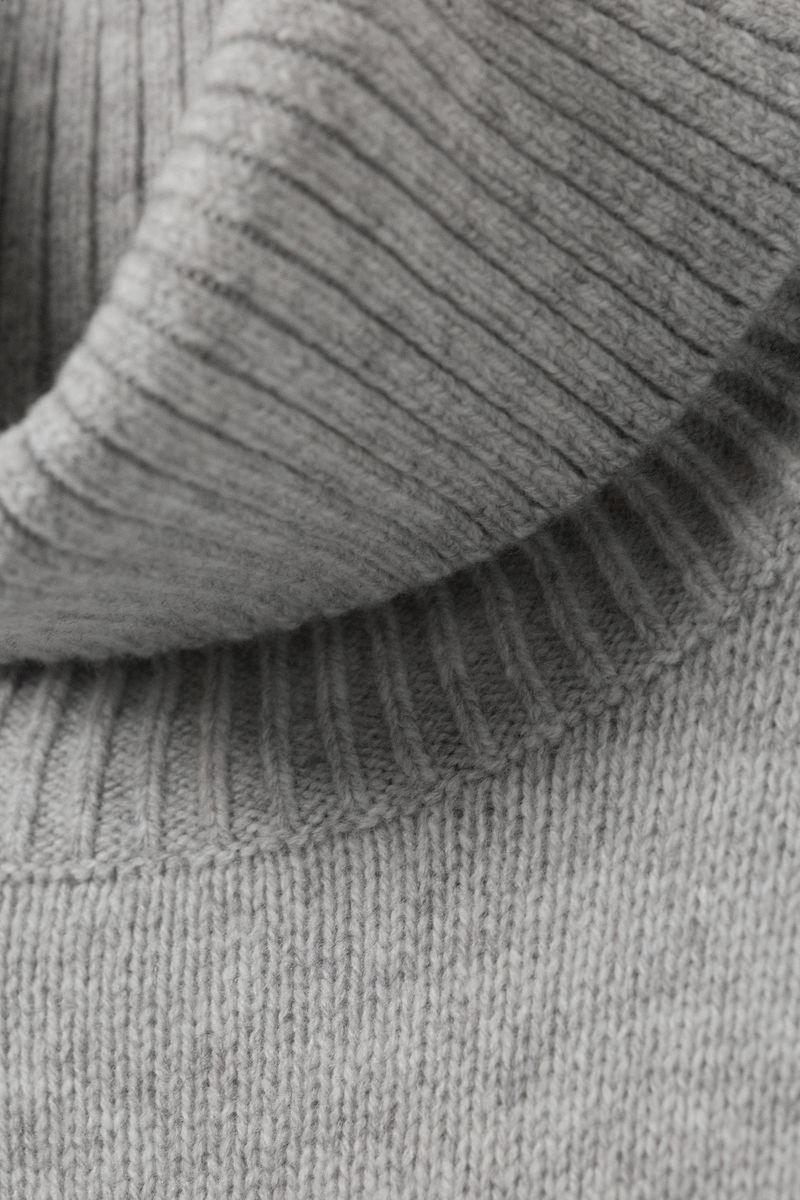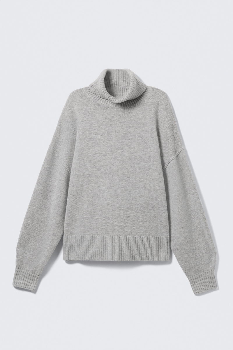 A turtleneck sweater crafted from soft wool, designed with an oversized fit. It features dropped shoulders, long sleeves, and ribbed detailing at the neck, cuffs, and hem.