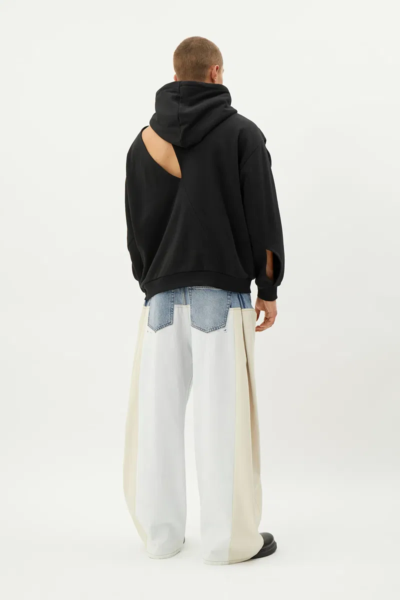 A stand-out oversized hoodie reconstructed from a soft cotton fleece jersey derived from previous collections. This avant-basic piece has an asymmetrical cut with a slash opening down the right front, over the shoulder and down the right back.