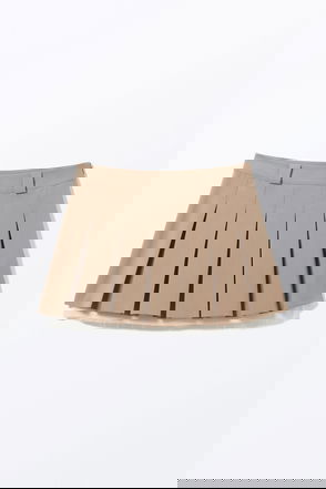 A pleated mini wrap skirt cut to a slim fit. It features side tie closure that is secured with a hidden jigger-button and inverted box pleats.