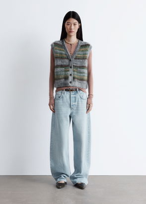 A v-neck vest with a slight crop, made from a soft organic cotton ribbed jacquard knit. This layering piece has full fashion knit detailing throughout with thicker ribbed details around the neck and edges.