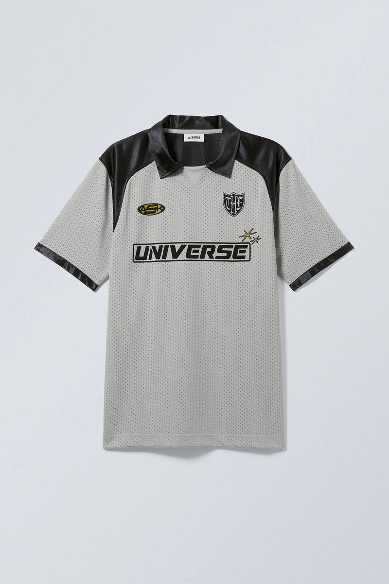 A regular fit soccer-inspired printed t-shirt made from a sporty recycled polyester mesh jersey. It has a shiny top panel, a shirt collar with a V-shaped front ribbed panel, and a twin-stitched hemline.