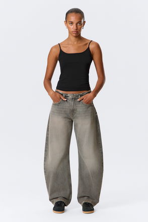 A pair of baggy straight leg jeans made from an organic cotton rigid denim enhanced with recycled cotton. They have a mid waist and five pocket detailing.