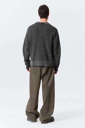 A regular length heavy knitted sweater made from a sturdy cotton yarn. Details feature a double-layer rib neck, slightly dropped shoulders with exposed seams, and ribbed details at the bottom and bottom sleeves.