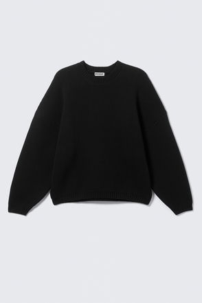 A regular length heavy knitted sweater made from a sturdy cotton yarn. Details feature a double-layer rib neck, slightly dropped shoulders with exposed seams, and ribbed details at the bottom and bottom sleeves.