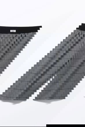 A pair of relaxed boxer-inspired mini shorts made from a plain cotton fabric. They have an elasticated waistband, roomy side seam pockets, and a fake fly.