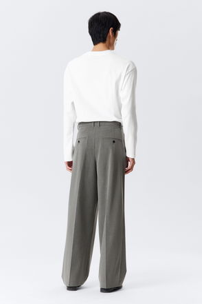 A pair of suit trousers cut to a relaxed fit, featuring a drawstring waistband, slanted side pockets, back welt pockets, and sewn front and back press-creases.