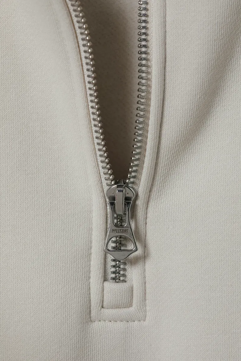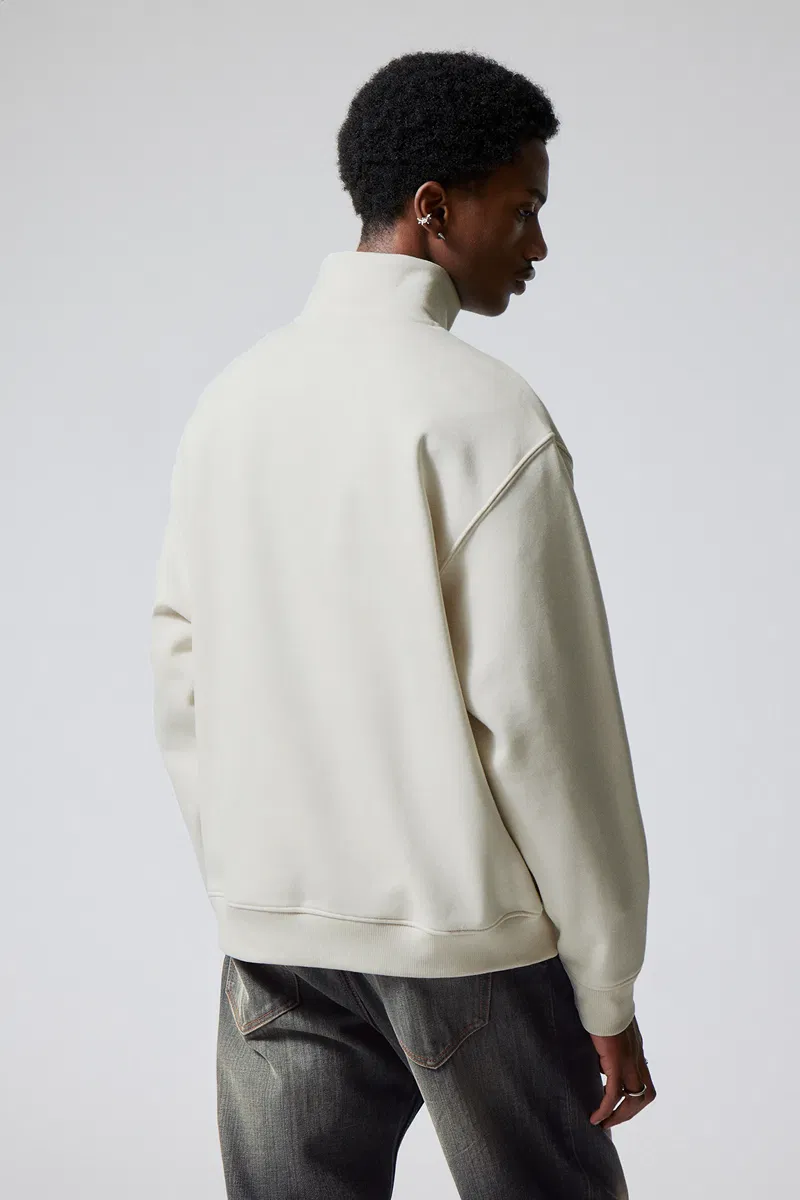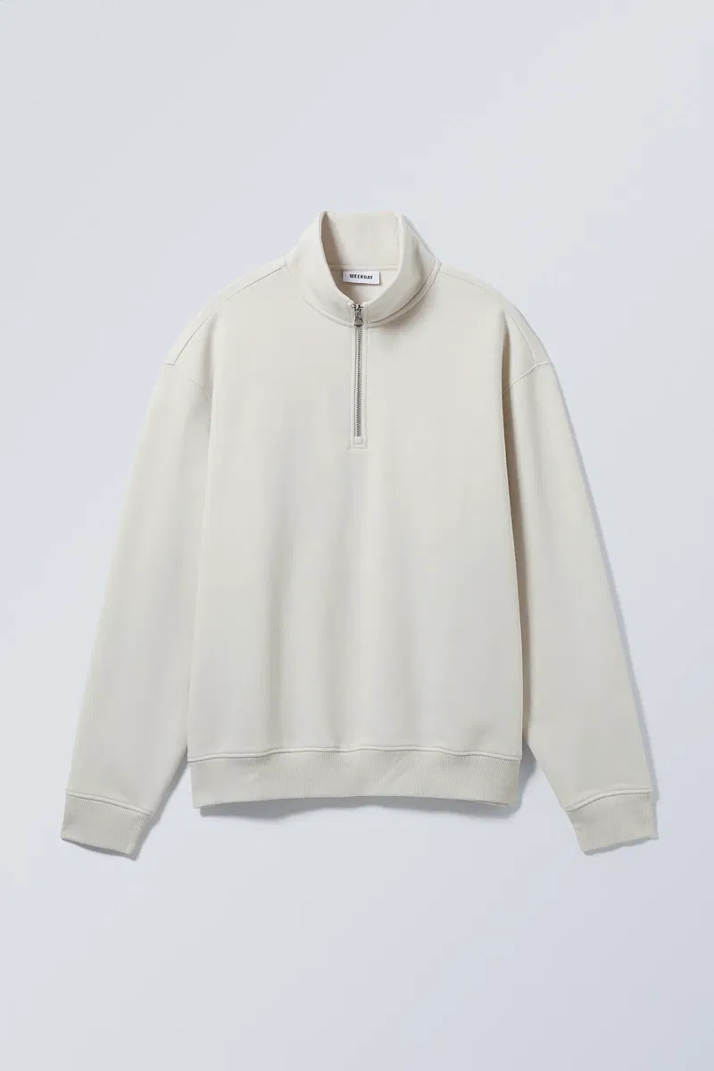 A loose fit half-zip jersey sweater made from a soft cotton and recycled polyester blend. This relaxed everyday piece has a double layered turtleneck, a ribbed hemline and cuffs.