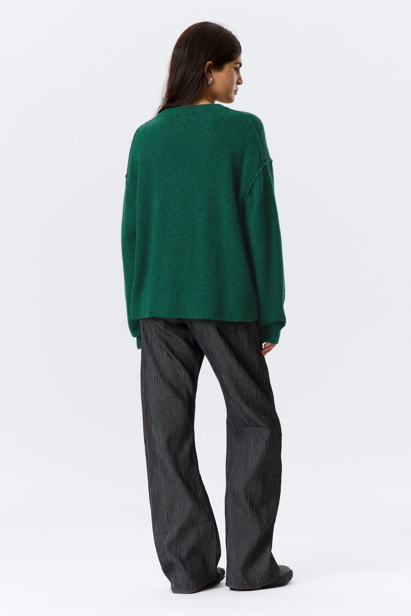 A relaxed-fit knitted sweater crafted from a soft recycled polyamide and recycled polyester blend, enhanced with a touch of recycled elastane and wool for added stretch and warmth. It features a round ribbed neckline, dropped shoulders, and ribbed edges.