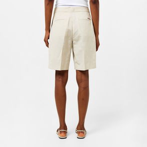 A pair of relaxed knee length shorts made from a soft and light linen blend. They have an elasticated waistband, side seam pockets, and neat blind-stitched hems.