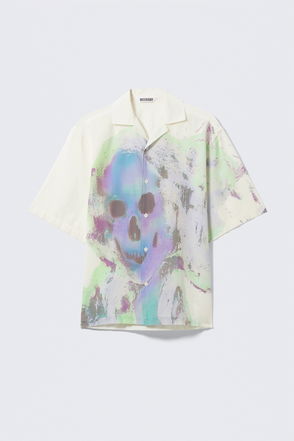 A buttoned long sleeve shirt with a resort collar made from a lightweight textured cotton jacquard. It has a front patch pocket, buttoned cuffs and a straight hemline.