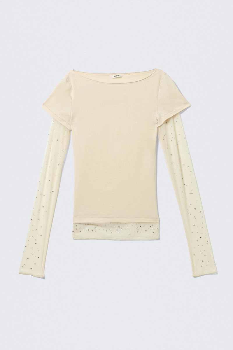 A slim-fit top crafted with contrast sleeves in sheer mesh, embellished with rhinestones. Designed with a round neckline, it features short sleeves layered over elongated mesh sleeves for a double-sleeve effect. Finished with a straight hem.