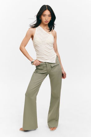 A pair of low waisted flared trousers made from a soft recycled polyester & EcoVero* viscose blend with a touch of recycled elastane for extra flexibility and comfort. They have two front welt pocket details and a back seam that ends in a slit that zips.
