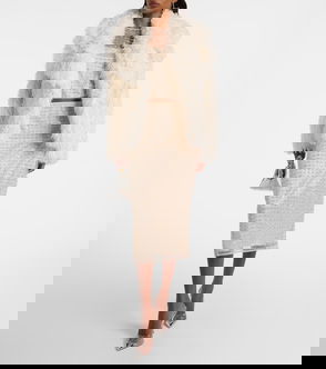 A cropped faux fur coat made from a soft and textured recycled polyester. This go-to piece for colder weather has wide arms, a large split collar, and side front pockets.