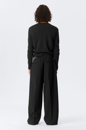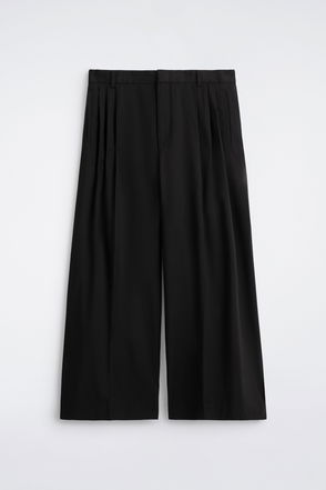 A pair of loose fitting trousers made from a soft organic cotton lightweight twill. They have a front and black pleat and have side slit and back slit pockets.