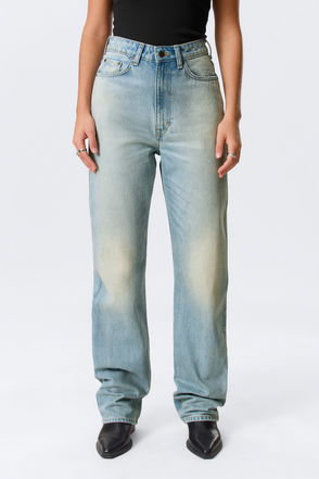 A pair of extra high waist straight leg jeans made from a rigid organic and recycled cotton denim. This popular style has a regular fit, classic five pocket detailing, and work well with most footwear.