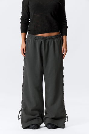 A pair of flared sweatpants made from a soft organic cotton velour enhanced with recycled polyester. They have a cozy elasticated drawstring waistband and inseam side-pockets.