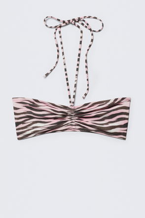 A stand-out triangle bikini top with minimal coverage made from a soft recycled polyamide enhanced with recycled elastane for extra comfort and flexibility. This mix and match favourite has ruched drawstring seams on the bottom and inner seams of each cup, adjustable. spaghetti straps and a front tie closure.Size S has an adjustable band length and fits and A/B cup.