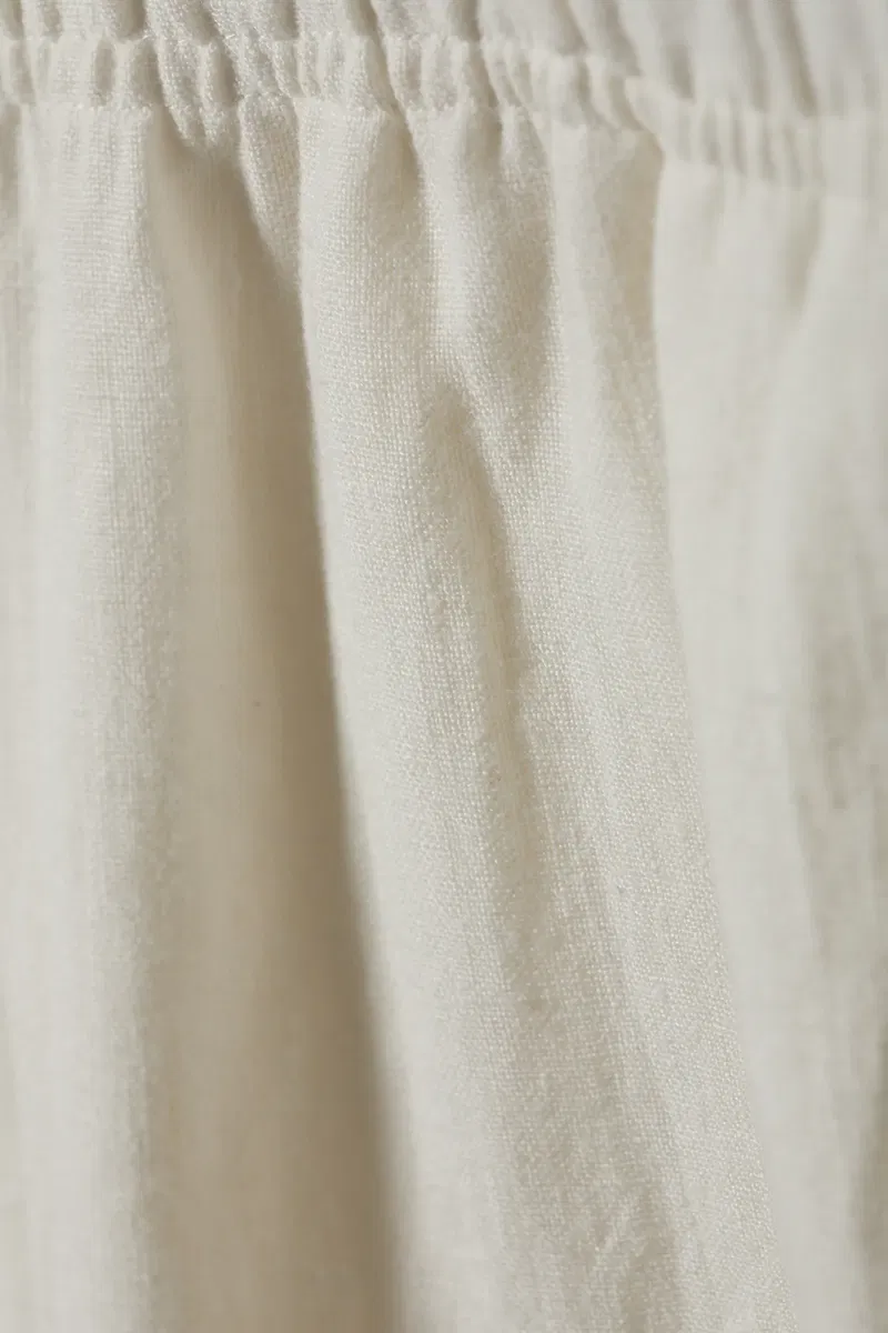 A pair of wide leg jogger style trousers made from a soft 100% linen. They are lightweight and loose fitting, and have an elasticated drawstring waist and side pockets.